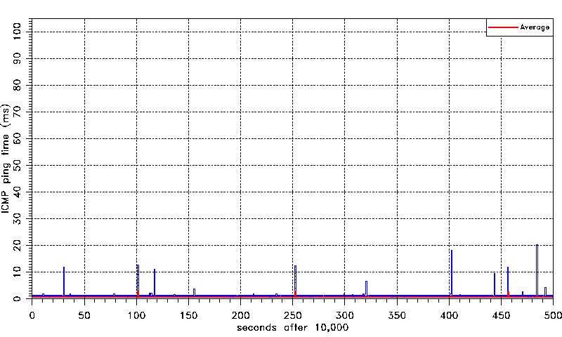 Ping times were recorded over a six hour period commencing withing a few minutes of rebooting all NetLab routers. Individual ping times were recorded to a file for 21600 pings (one ping per second for 6 hours). No packets were lost during any of the experiments.